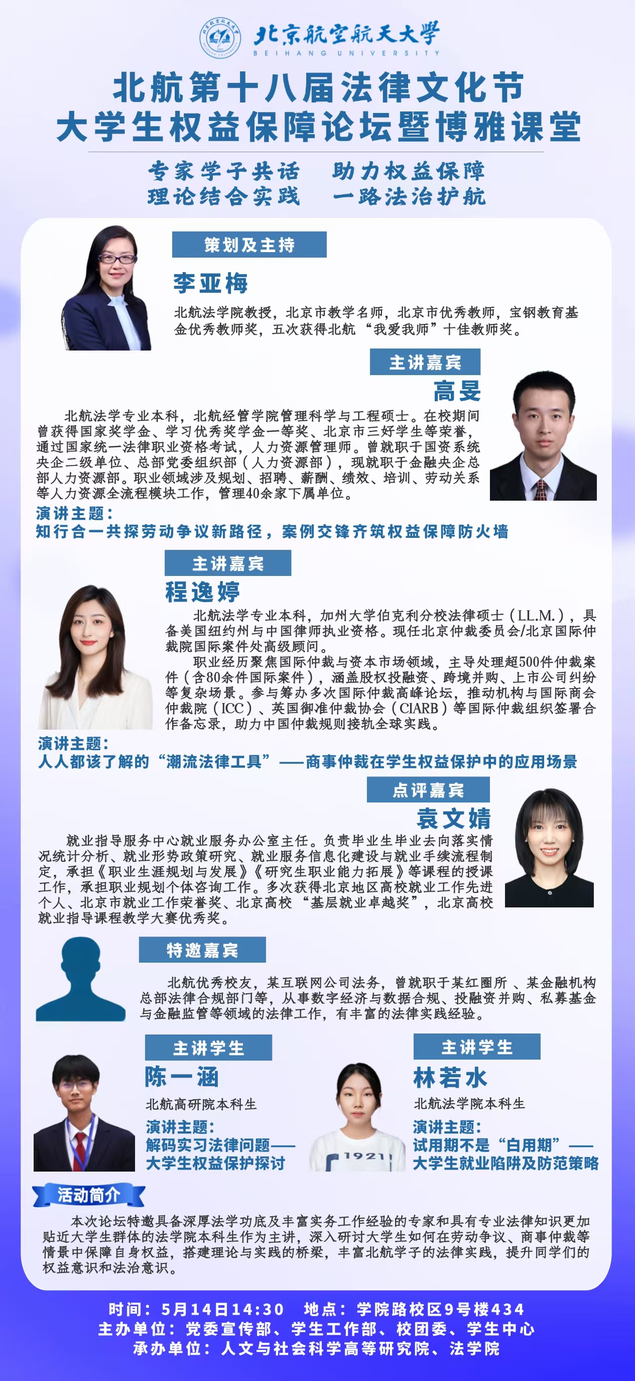 2025年5月14日下午,北航第十八届法律文化节大学生权益保障论坛在学院路校区9号楼434报告厅隆重举行。本次论坛以“理论结合实践,法治护航权益”为核心,聚焦大学生实习、试用期风险防范、劳动争议处理及商事仲裁等热点议题,特邀校内外专家、实务工作者与在校学子同台对话,搭建理论与实践交融的平台,助力北航学子提升权益意识与法治素养。论坛由党委宣传部、学生工作部、校团委、学生中心联合主办,人文与社会科学高等研究院与法学院共同承办,吸引了来自全校多个专业、不同年级的本科生及研究生积极参与,并作为博雅课堂面向全校开放,反响热烈。