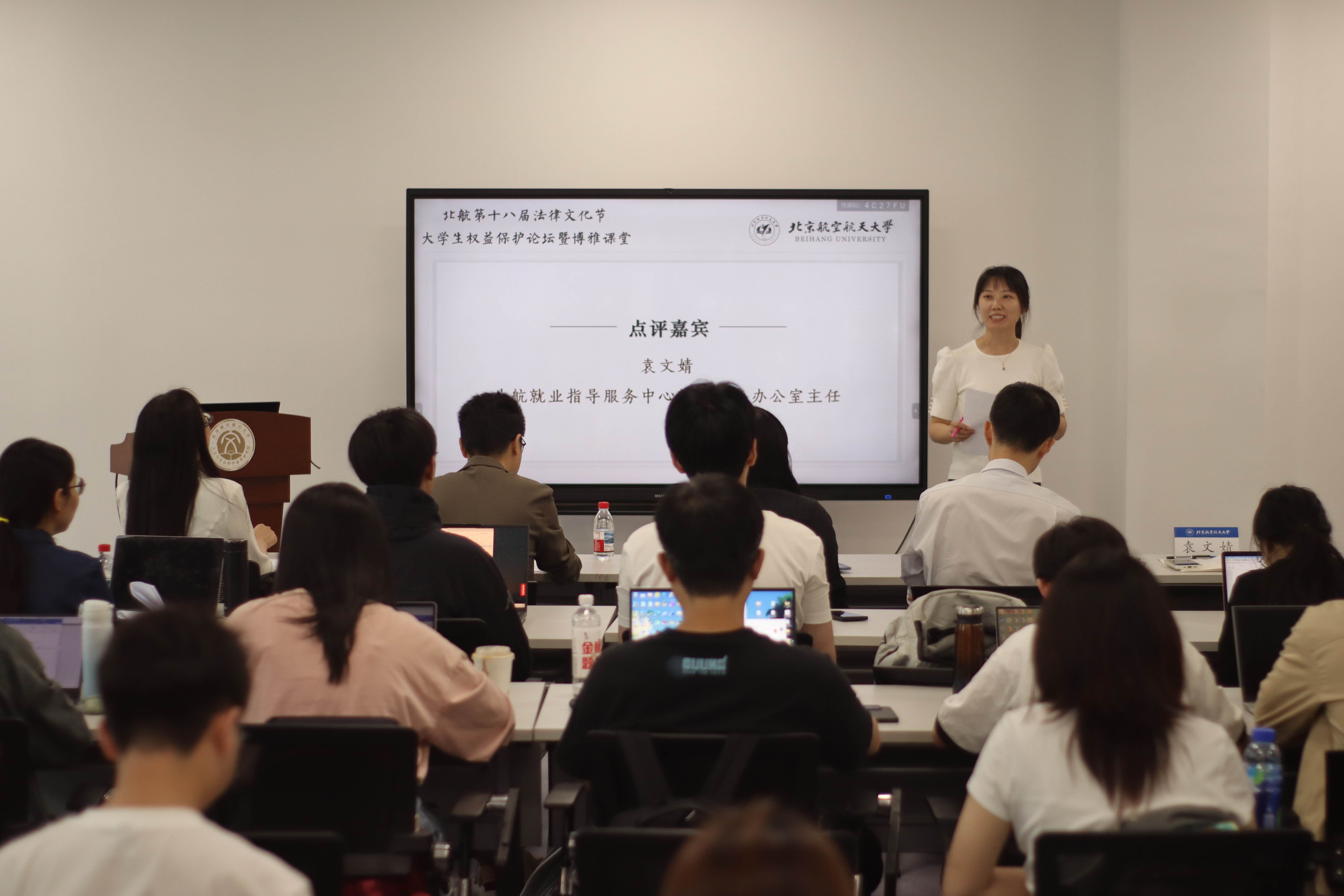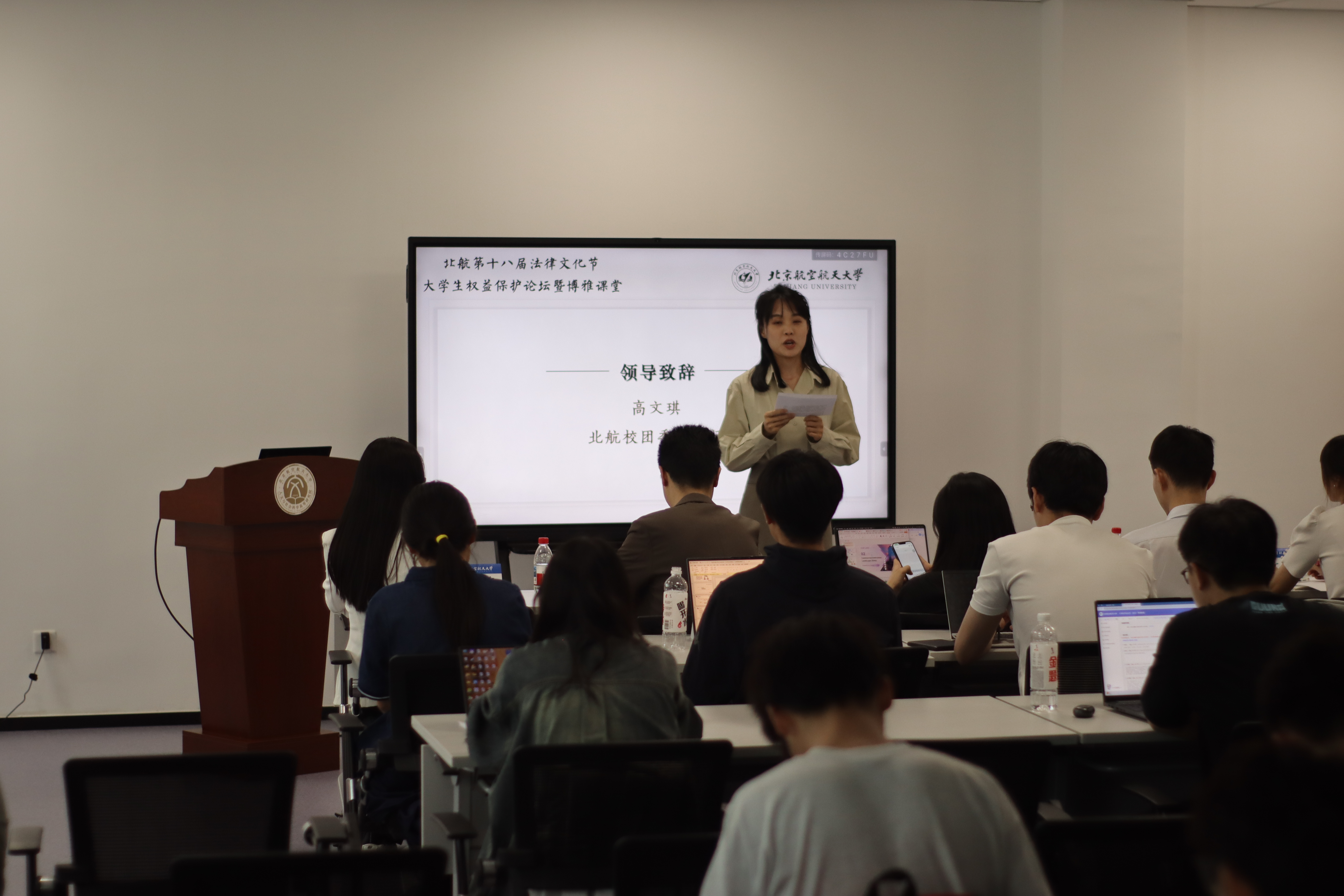 随后,北航校团委副书记高文琪致开讲辞。她指出,五四青年节刚过,青年学子更需以法治思维武装自我,在新时代扛起维护权益的旗帜。“法治中国这个宏图,需要有人运筹帷幄,也需要有人躬身耕耘去播种法治的种子。”高文琪副书记寄语青年学子,鼓励大家在实践中深化对习近平法治思想的理解,争做新时代法治建设的生力军。